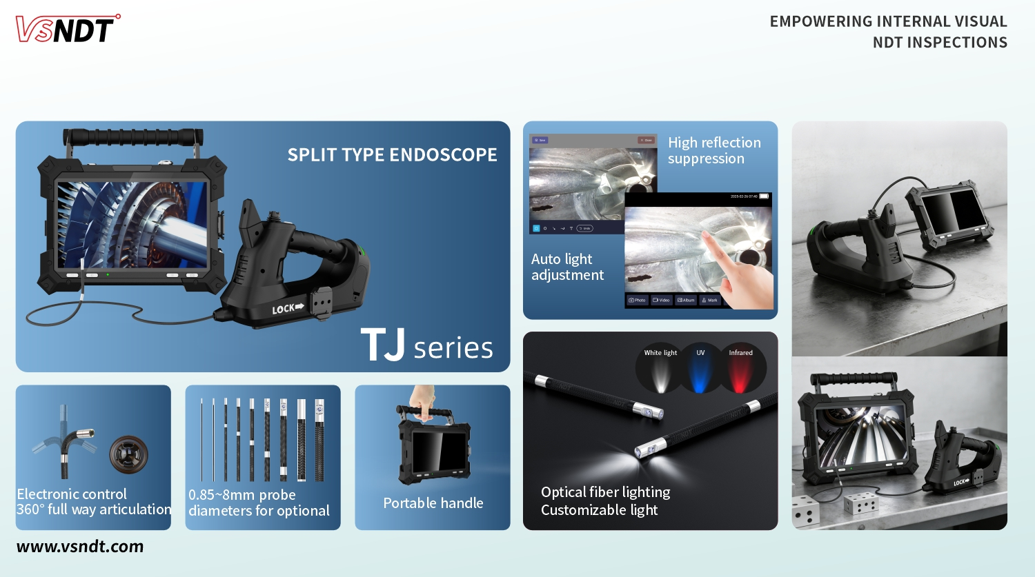 In high-end manufacturing and precision maintenance sectors—such as aerospace and power generation—invisible internal hazards, inaccessible confined spaces, and the inefficiency of traditional inspection methods have long been persistent industry pain points. With years of deep expertise in the field of industrial endoscopy, Shenzhen VSNDT introduces the TJ Series Modular Endoscope. Featuring scenario-specific design, robust high performance, and a highly efficient user experience, this device directly addresses the operational challenges faced by customers in the field, making high-end inspection more stable, faster, and hassle-free.
